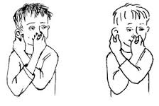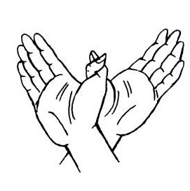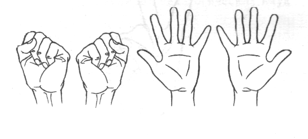 евая ладонь повернута к себе, пальцы в кулак, а большой - в сторону. Правая рука прямой ладонью вниз прикасается к мизинцу левой. Потом - одновременная смена положений рук.