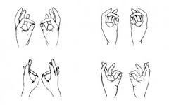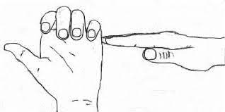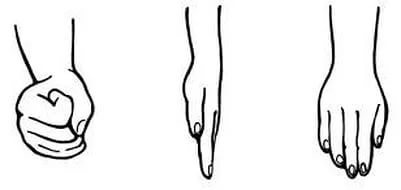илка: Указательный, средний и безымянный пальцы вытянуты вверх, расставлены врозь и напряжены. Большой палец прижимает мизинец к ладони.