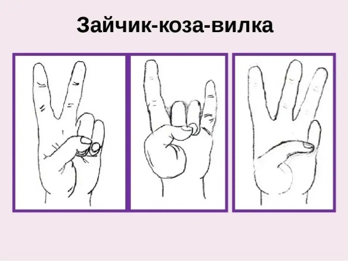 Зайчик: Указательный и средний пальцы вытянуть вверх, мизинец и безымянный прижать к ладони большим пальцем.