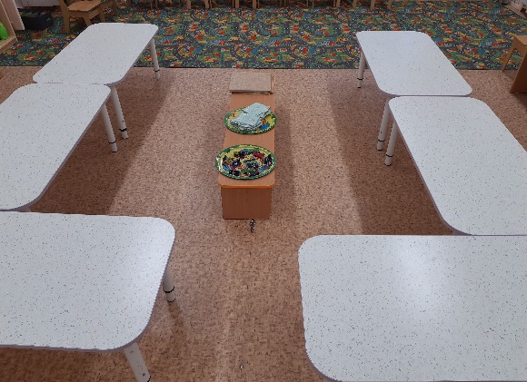 Помощник воспитателя заранее расставляет столы для продуктивной деятельности. Заготовки сапог из цветной бумаги разложены на отдельном столе, так же, как и заготовки геометрических фигур. Столы расставлены так, чтобы детям было удобно подойти к ним с любой стороны.