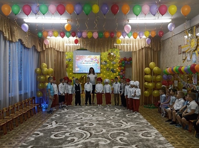 Воспитатели исполняют песню «С днём рождения родной, поздравляем мы тебя!».