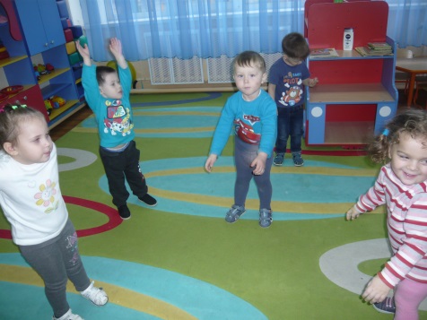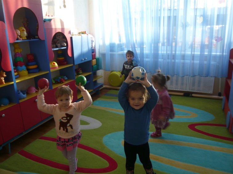 Воспитатель: Мяч похож на гладкое яичко. Прокатите его друг другу. (Дети садятся на пол и прокатывают мячи друг другу) 2-3 раза.