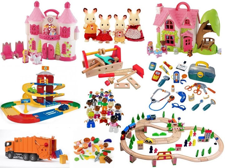 1. Игрушки, отображающие реальную жизнь - куклы, фигурки животных, мебель, предметы обихода, коляски и т.д.
