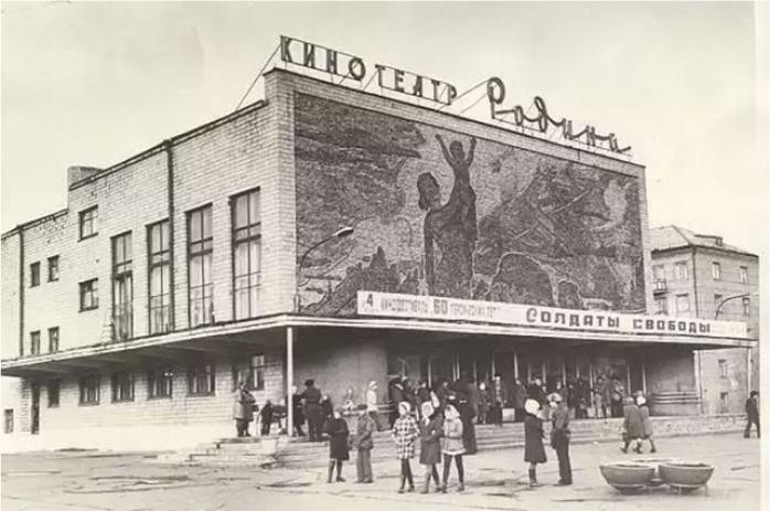 Евгений Степанович Кобытев (1910 – 1973). | кинотеатр «Родина» с мозаичным панно «Родина-мать» на фасаде, фото от 24 декабря 1965 года, автор снимка не известен. |