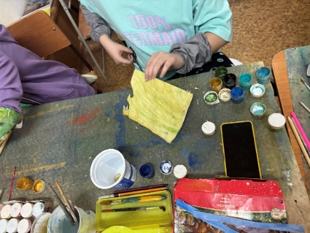 - подготовить листы бумаги с имитацией фактуры шальки, для этого лист белой бумаги красим гуашевыми красками охристыми, зеленоватыми, коричневыми, красными, черными, желтыми цветами (цвет подбираем по фото с изображением панно "Родин-Мать»);