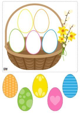 В:У нас есть уже красивые яйца их осталось только сложить в корзину.Необходимо их наклеить на заготовленные места.