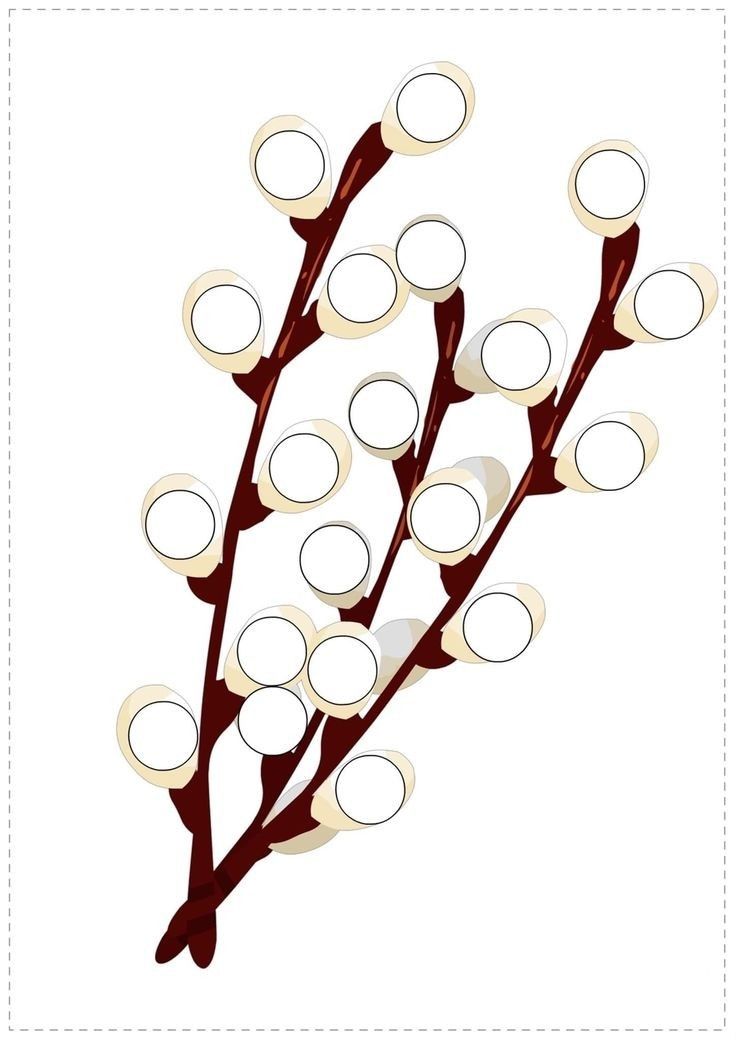 Ребята, а давайте с помощью пластилина изобразим веточки вербы. Перед вами лежат заготовки в виде картона с нарисованными веточками и кусочек жёлтого пластилина.
