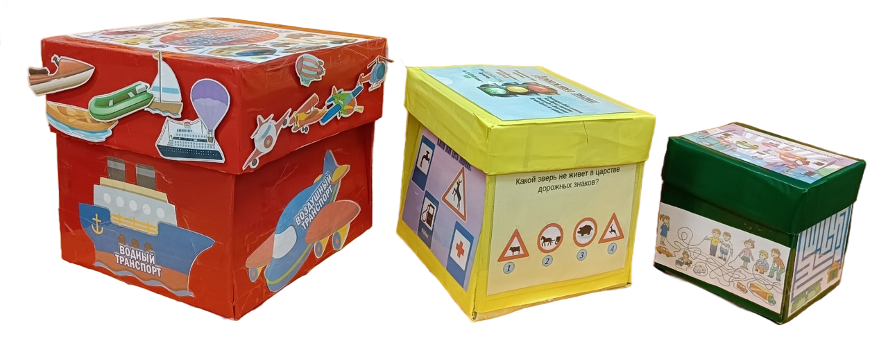 Дидактическое игровое пособие «Короба безопасности», которое представляет собой 3 короба, по принципу матрешки, с играми по ПДД.
