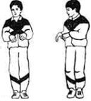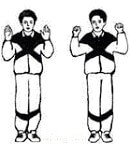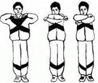 «Обними плечи». Стоя, поднимите руки на уровень груди и согните. Делая вдох, резко обнимание себя за плечи ладонями, старайтесь руки свести максимально. Они должны быть параллельны, но не скрещены, во время упражнения руки не меняйте. Не рекомендуется после инфаркта, при пороках сердца.