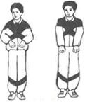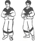 «Кошка». Стоя, ноги на ширине плеч, руки согнуты в локтях у туловища, кисти спокойно свисают. Делайте поворот туловища вправо и одновременно полуприседание, в этот момент должен быть вдох, при этом руки выполняют хватательное движение. При возврате в исходное положение выдох. Затем в обратную сторону.