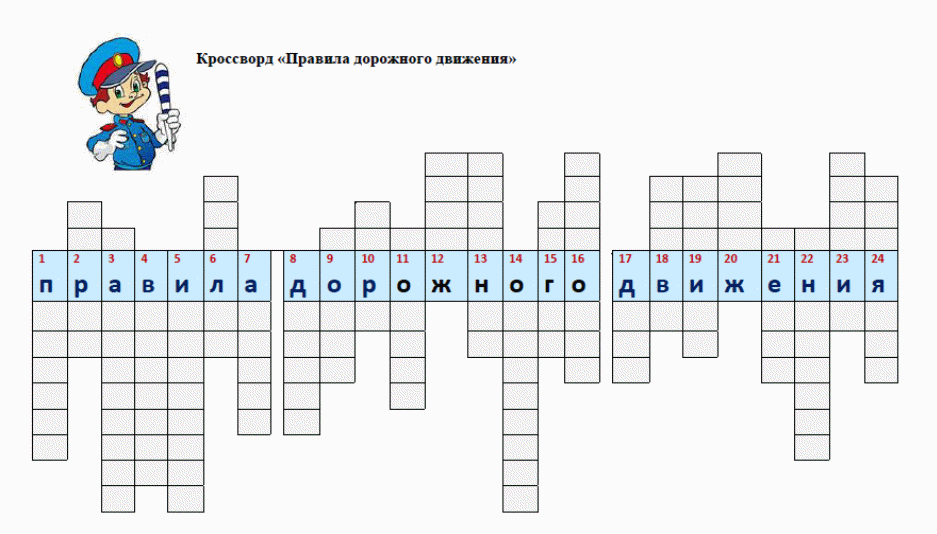 Ответы на кроссворд: 1. Переход 2. Штраф 3. Нарушитель 4. Велотрек 5. Инспектор 6. Италия 7. Англия 8. Дорога 9. Шоссе 10. Фара 11. Тормоз 12. Гараж 13.Зелёный 14. Остановка 15. Обгон 16. Светофор 17. Дети 18. Права 19. Машина 20. Париж 21. Зебра 22. Внимание 23. Россия 24. Стоянка. |