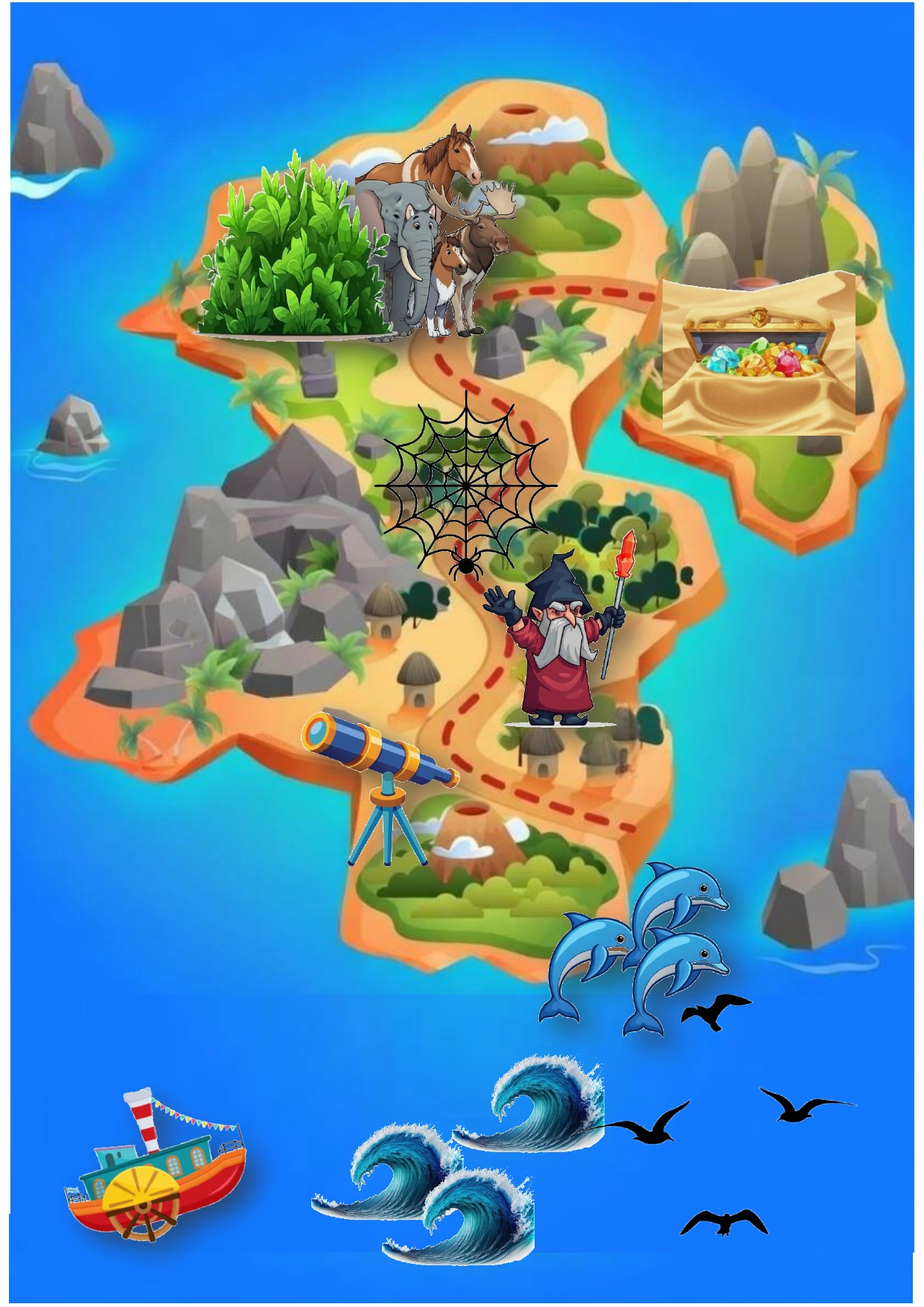 - Давайте посмотрим, что дальше ждет на острове. Здесь закопаны какие-то сокровища. Возьмите кисточки и назовите все, что там найдете.
