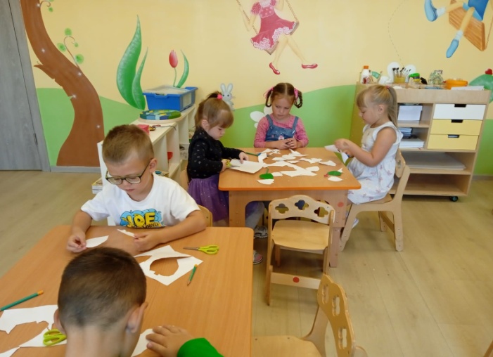 «Художественно-эстетическое развитие» | ООД: Рисование(предметное) Тема: «Портрет осеннего листка» Цель:Создавать условия для применения детьми умения подбирать нужные цвета и сме6шивать краски для их получения. Учить подбирать подходящие техники для изображения осеннего пейзажа, передачи красоты природы. Тема: «Загадки с грядки» Цель: Учить передавать форму и характерные особенности по их описанию в загадках; создавать выразительные и фантазийные образы; самостоятельно смешивать краски для получения нужного оттенка; уточнять представление о хорошо знакомых природных объектах. Тема: «Листопад» (краски осени) Цель: Учить детей рисовать с натуры, передавая форму и окраску осенних листьев. Совершенствовать изобразительную технику (смешивать акварельные краски для получения сложных оттенков и передачи осеннего колорита). Познакомить с новым способом получения изображения – наносить краску на листья, стараясь передать окраску и «печатать» ими на бумаге. Поощрять детей воплощать в художественной форме свои представления, переживания, чувства; вызвать желание передавать характерные признаки объектов и явлений природы; поддерживать творческие проявления. Тема: «Деревья в нашем парке» Цель:Учить рисовать лиственное дерево, передавая характерные особенности строения ствола и кроны (береза, дуб, ива, осина) передовать цвета; развивать технические навыки в рисовании карандашами, красками и другими материалами. Совершенствовать изобразительные умения и развивать способности к созданию выразительных образов, используя различные средства изображения. Рисование (сюжетное) Познакомить с новым способом создания абстрактной композиции – свободное, безотрывное движение карандаша или фломастера по бумаге (упражнение «линия на прогулке»). Совершенствовать технику рисования акварельными красками (часто промывать и смачивать кисть, свободно двигать ею во всех направлениях). Тема: «Яблоня с золотыми яблоками в волшебном саду». Цель: Учить детей создавать сказочный образ, рисовать развесистые деревья, передавая разветвленность кроны фруктовых деревьев; изображать много «золотых» яблок. Закреплять умение рисовать красками (хорошо промывать кисть перед тем, как набирать краску другого цвета, промакивать кисть о салфетку, не рисовать по сырой краске); Тема: «Идет дождь». Цель:Учить детей образному отражению в рисунках впечатлений от окружающей жизни. Закреплять умение строить композицию рисунка. Учить детей пользоваться приобретенными приемами разнообразной передачи явления. Упражнять в рисовании простым графитным и цветными карандашами (цветными восковыми мелками). Тема: «Осенний лес». Цель: учить детей отражать в рисунке осенние впечатления, рисовать разнообразные деревья (большие, маленькие, высокие, низкие, стройные, прямые и искривленные). Учить по- разному изображать деревья, траву, листья. Закреплять приемы работы кистью и красками. Развивать активность, творчество. Продолжать формировать умение радоваться красивым рисункам. Аппликация Тема: «Огурцы и помидоры лежат на тарелке» Цель: продолжать отрабатывать умение детей вырезать предметы круглой и овальной формы из квадратов и прямоугольников, срезая углы способом закругления. Развивать координацию движения обеих рук. Закреплять умение аккуратно наклеивать из