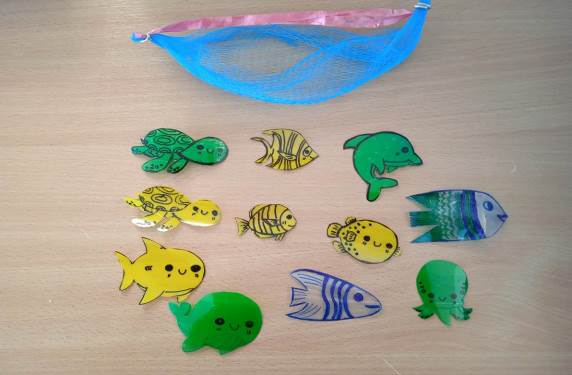 Игровое пособие «Поймай рыбку», емкость с водой. (Игровое пособие изготовлено с использованием пластика, цветного скотча, перманентного маркера).