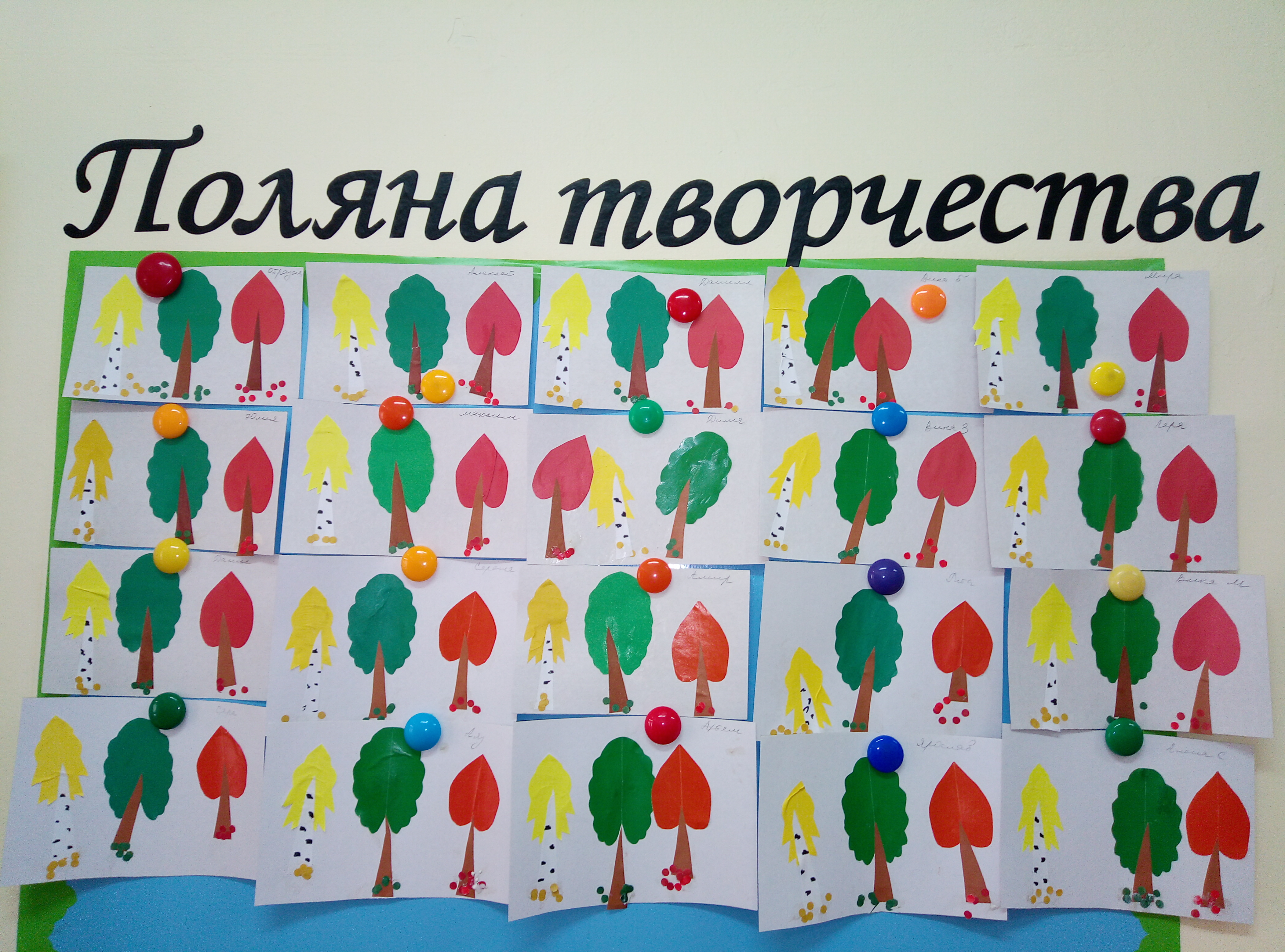 Вырезаем наши заготовки: крону деревьев красного, желтого и зеленого цвета, стволы деревьев. Из оставшихся кусочков с помощью дырокола приготовим кружочки-опавшие листья. Вырезанные заготовки раскладываем перед собой. Приклеиваем крону деревьев, поверх-стволы. На белом стволе черным фломастером имитируем ствол березы. Под деревьями размещаем кружочки-листочки. Композиция готова!