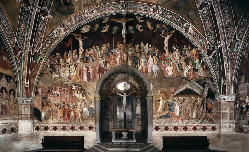 Андреа да Буонайути уподобил композицию великолепному сияющему иконостасу, состоящему из двух ярусов. В верхнем изображался трон с восседающим на нем Фомой Аквинским, который покоился на нижнем, служащем ему как бы пьедесталом, с аллегорическими фигурами семи христианских добродетелей и семи свободных искусств, на которые в своем учении опирался видный схоласт. На противоположной стене на фреске «Триумф покаяния» в аллегорической форме были представлены устав и деятельность ордена в борьбе с еретиками. Согласно доминиканской доктрине, еретики - волки, нападающие на овец, которых защищают многочисленные псы, отгоняющие и убивающие волков. Вовремя вспомнившие о спасении души обращаются с покаянием к доминиканскому монаху, который отпускает грехи, и раскаявшиеся души, проходя через врата рая, пополняют число спасенных (см. цв. вкл.). Художник ввел в композицию жанровые элементы - пляску девушек, игры детей в кронах деревьев, здание Флорентийского собора, что придавало событию особую достоверность. Этому же способствовали и портреты современников. Так, среди изображенных пап, кардиналов, епископов, королей, рыцарей, христианских князей художник поместил Петрарку. Располагая сцены уступами друг над другом, как на склоне холма, поворачивая их под различными углами, разделяя пространственными паузами, Андреа да Буонайути создал ощущение свободно расстилающегося, чуть вогнутого или чуть выпуклого пространства. Эта ступенчатая пространственная композиция уподоблена многоцветному роскошному «ковру», переливающемуся розовыми, сиреневыми, белыми, изумрудно-зелеными бликами.