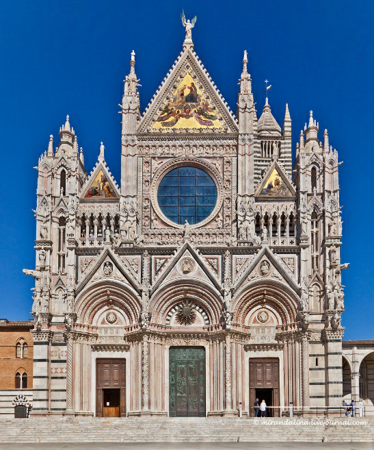 Но высшим достижением треченто в Сиене является Дуомо, кафедральный собор, которому нет равных по завершенности во всей Италии. Гармоничность архитектурных пропорций, пестрота мраморных полос, мерцающая мозаика на щипцах и тимпанах порталов сообщают ему волшебную элегантность. Настоящее художественное чудо -мраморная инкрустация пола в Сиенском соборе, представляющая собой живопись в мраморе светотенью, начало которой, как писал Вазари, положил сиенский живописец Дуччо ди Буонинсенья, за что он «заслуживает одобрения и похвалы.