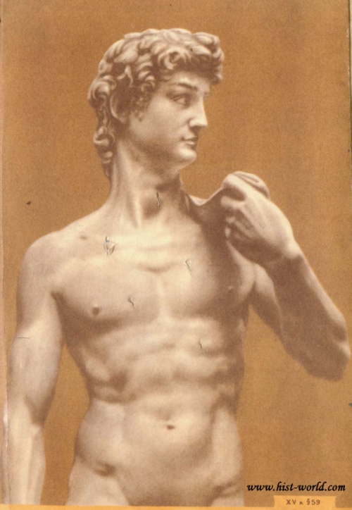 Микела́нджело Буонарро́ти, полное имя Микела́нджело ди Лодо́вико ди Леона́рдо ди Буонарро́ти Симо́ни — итальянский скульптор, художник, архитектор, поэт и мыслитель. Один из крупнейших мастеров эпохи Возрождения и раннего барокко. Его произведения считались наивысшими достижениями искусства Возрождения ещё при жизни самого мастера. Микеланджело прожил почти 89 лет, целую эпоху, от периода Высокого Возрождения к истокам Контрреформации. За этот период сменилось тринадцать пап римских — он выполнял заказы для девяти из них Горячий патриот, Микеланджело тяжело переживал бедствия, постигшие Италию в начале XVI века. В статуях и картинах отразилась его мечта о человеке - борце, о герое, способном на жертвы ради спасения родины. Он изображал людей с могучим телом и сильной волей. Из огромной глыбы мрамора скульптор высек статую «Давид» высотой 5,5 метра. Современники прозвали эту статую «Гигантом». Скульптор изобразил легендарного юношу-пастуха, который вышел на поединок с грозным великаном и уложил его метким ударом камня. «Давид» был установлен на центральной площади Флоренции и считался с тех пор покровителем города. Микеланджело принял участие в сооружении собора св. Петра в Риме. Этот собор в течение нескольких десятилетий строили самые знаменитые итальянские архитекторы. Микеланджело разработал проект главной части храма - его огромного купола. Храм св. Петра является лучшим образцом архитектуры Возрождения.В творчестве Микеланджело проявились лучшие черты культуры В