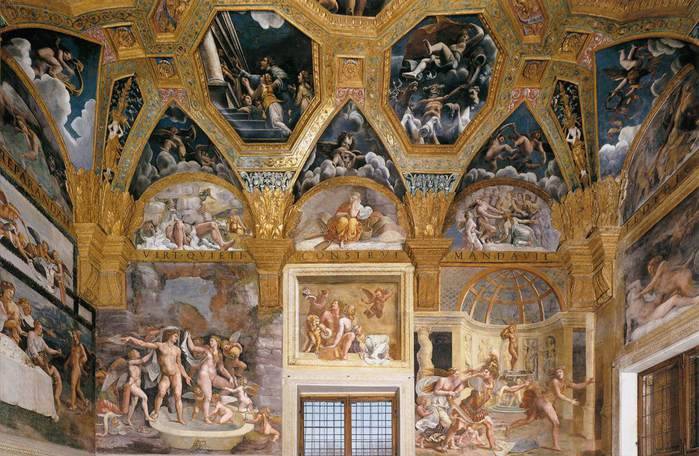 собенно сильно это видно по фрескам, созданным Джулио Романо в 30-х годах в Зале Гигантов. Стены и плафон в этом помещении благодаря мастерству живописца являются единой композицией, изображающей грандиозную катастрофу с мифологическим сюжетом, в котором задействован карающий молниями Юпитер.