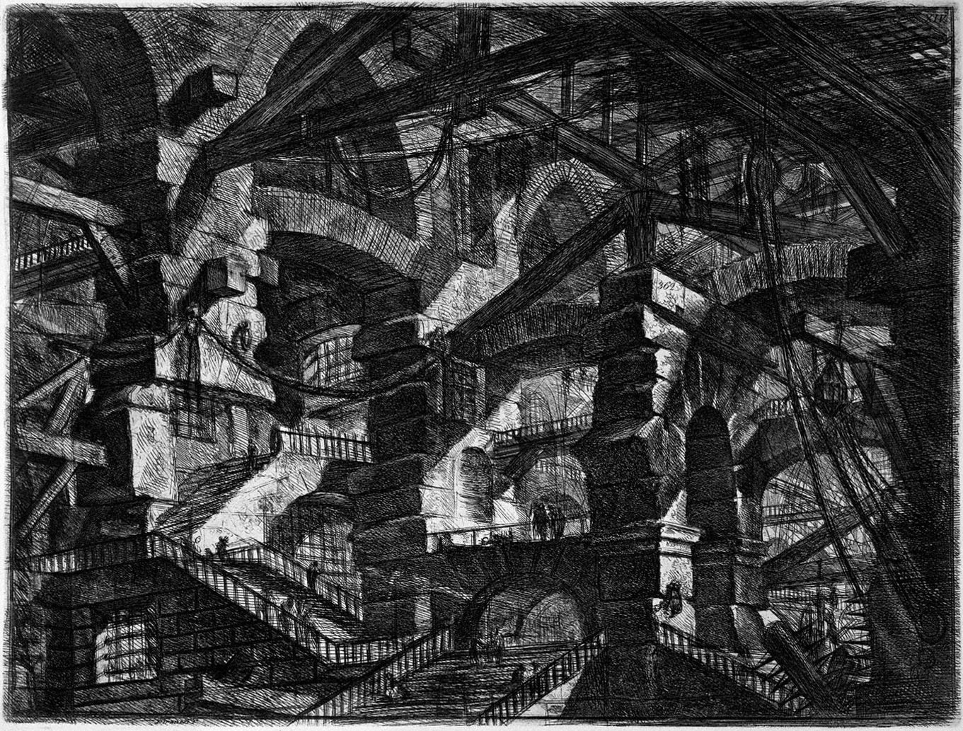Джованни Баттиста Пиранези (1720–1778) — итальянский живописец, график и архитектор. Он создавал сотни гравюр с видами Рима, проектов воображаемых зданий и архитектурных фантазий. Самыми загадочными среди них были «Тюрьмы», впервые изданные в 1745 г. и повторно ок. 1760 г. На этих гравюрах изображен странный мир. Сначала кажется, что это интерьеры каких-то гигантских зданий, но нет ни одного окна. Награможденные друг на друга подвесные мосты, башенки, непонятные конструкции заполнены орудиями пыток и крошечными фигурками людей, которые карабкаются по стенам и лестницам или снуют в разных направлениях. «Тюрьмы» освещены загадочным светом, источник его не ясен. Особую роль играют лестницы — зритель не видит, куда они ведут, где начинаются и где заканчиваются. Вместе с тем они, образуя множество пересекающихся перспектив, запутывают пространство подобно лабиринту. Лестницы Пиранези несут в себе глубокий смысл: они обозначают рай и преисподнюю; лестница, неустойчивая сама по себе, является символом неопределенности и страха.