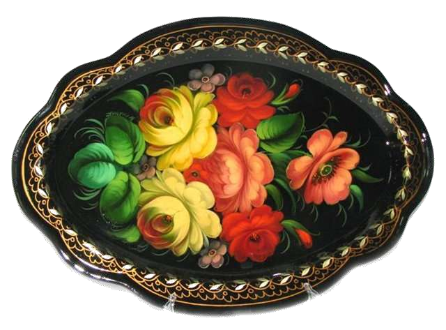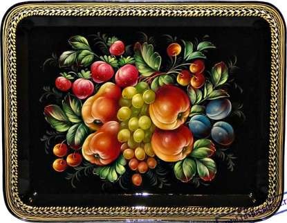 Каждый поднос неповторим, расписывается от руки масляными красками без применения трафаретов и образцов, то есть по воображению.
