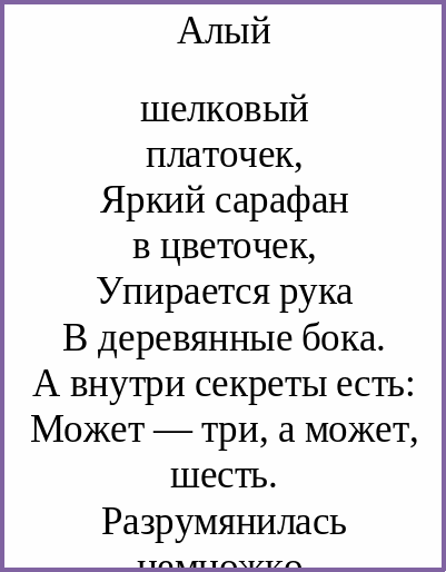 Платки,каксказочныептицы, Мой город превратили в сад, И, от того слова созвучны; Посад, и сад, и палисад.