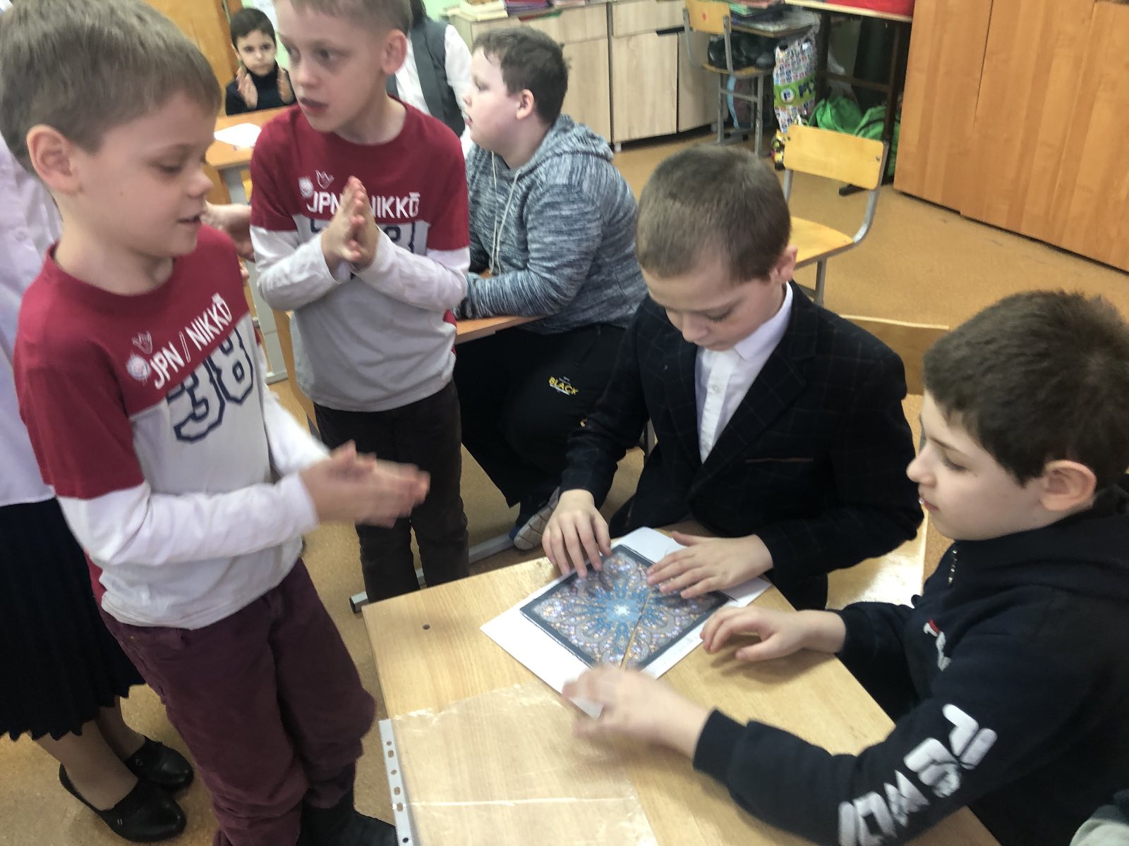 Подмосковный промышленный город. Дети собирают орнамент из мозаики.