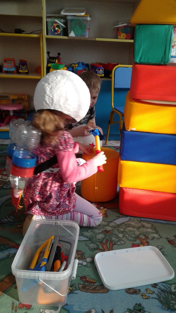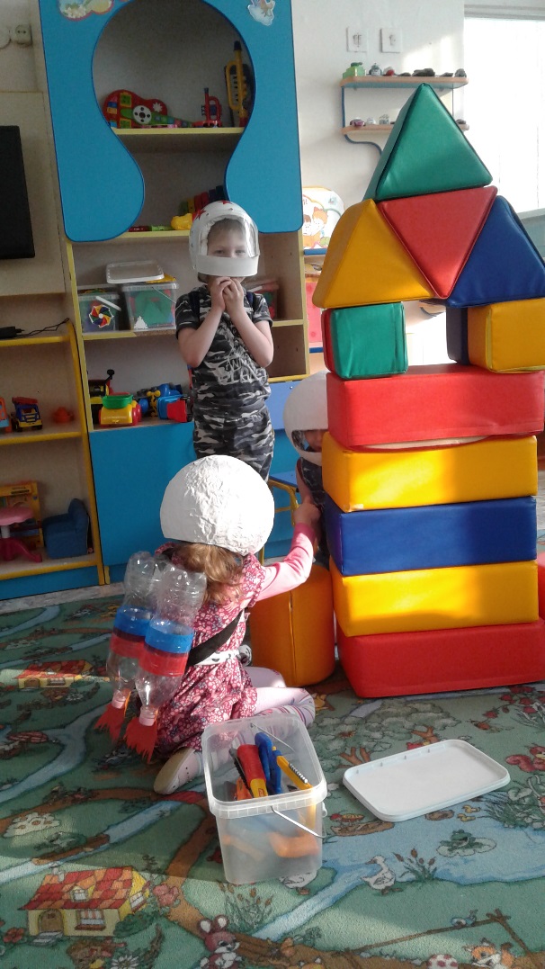 Дети приступают к строительству корабля, вспоминают его устройство – отсеки, люки, иллюминаторы, пульт управления.