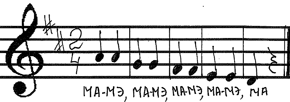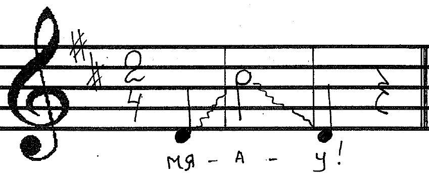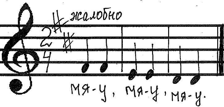 Увидели, как щенок приветствует огромного старого пса звонким лаем. Лаем «Гав, Гав» на звуке «До» второй октавы. Ему отвечает большая собака на звуке «До» первой октавы.