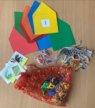 Дидактическое пособие состоит из домиков разного цвета: красного, зеленого, синего. На домиках стоят номера: 1, 2, 3 (для определения слов с различной слоговой структурой.) Цвет помогает детям правильно заселить звуки: гласные, согласные (твердые и мягкие) в домики. К пособию прилагается коробочка с предметными картинками, мешочек с буквами.