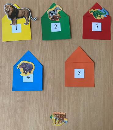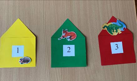Оборудование: три домика с разными цифрами в окошках (один, два, три), набор предметных картинок: ёж, волк, медведь, лиса, заяц, лось, носорог, зебра, верблюд, рысь, белка, кот, носорог, крокодил, жираф…)