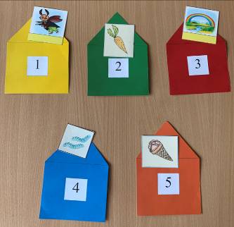 Ход игры: Можно просто использовать картинки, названия которых состоят их разного количества слогов. Ребёнок берёт карточку, называет изображённую на ней картинку, определяет количество слогов в слове и самостоятельно кладет к соответствующему домику в зависимости от цифры в окошке.
