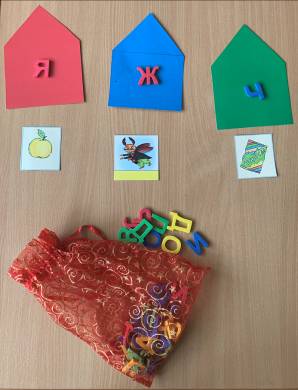Ход игры:при уточнении акустико-артикуляционных звуков ребенку предлагается достать букву и определить заданную букву, используя тактильно-кинестетический анализатор. Соотнести соответственно с домиком по цвету.