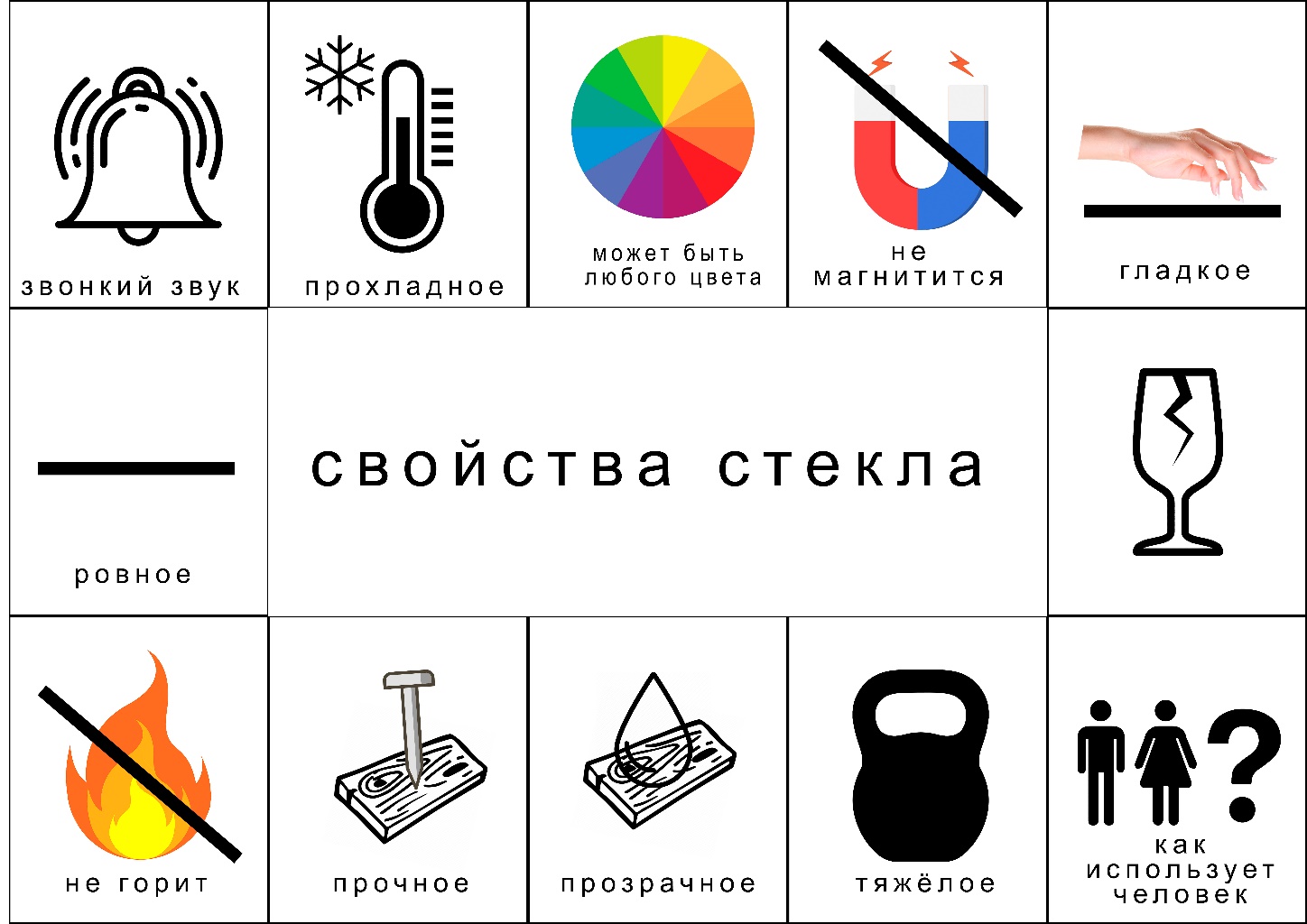 - Есть ли у стекла и пластмассы ещё одинаковые свойства? У вас на столе лежат не только стеклянные предметы, но и пластмассовые, проведите рукой сначала по стеклянному предмету, потом по пластмассовому. (дети выполняют указание). Какое ещё одно одинаковое свойство вы можете выделить у стекла и пластмассы, если провести по ним рукой? (они гладкие)