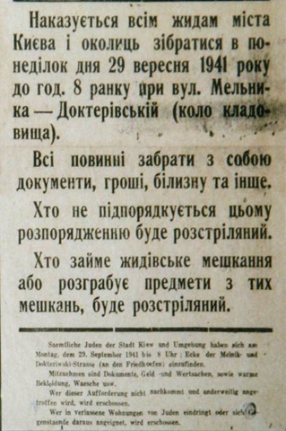 Немецкие войска вошли в Киев 19 сентября 1941 года. В этот же день начались грабежи и репрессии против евреев.