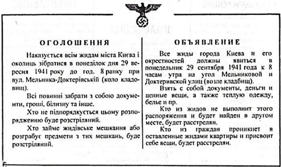 езде появились объявления ( их было более 2000 ), в которых евреям предписывалось, якобы « для переселения», собраться у еврейского кладбища и взять с собой деньги на похороны. За неявку расстрел.( Первый расстрелян 27 сентября 1941 года – 752 пациента психиатрической больницы им Ивана Павлова).[2]
