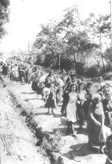 «Они выходили еще затемно, чтобы оказаться пораньше у поезда и занять места. С ревущими детьми, со стариками и больными, плача и переругиваясь, выползло на улицу еврейское население огородного колхоза. Перехваченные веревками узлы, ободранные фанерные чемоданы, заплатанные кошелки, ящички с плотницкими инструментами… Старухи несли, перекинув через шею, как гигантские ожерелья, венки луку – запас провизии на дорогу»
