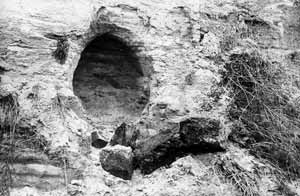 Остатки печей и землянка, где укрывались заключенные, сжигавшие трупы