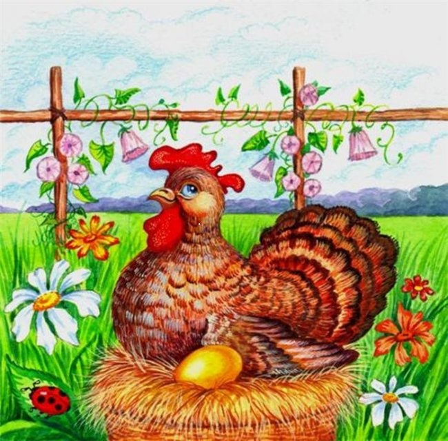 Перепугалась курочка, бросилась к хозяйке, кричит: