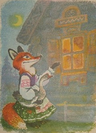 Хозяевам делать нечего, они лисичке гуся отдали. Та гуся взяла, пошла дальше по дороге и довольная поет: