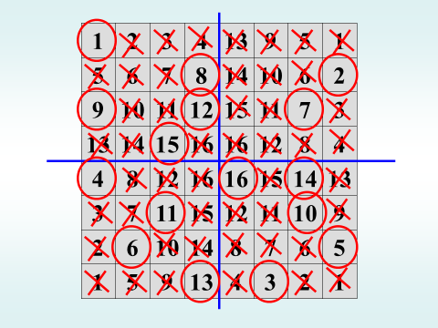 Освоение новых умений | Практикум Изготовление решетки | Способ шифровки основан на повороте квадрата вокруг его центра. Поворот- это геометрическое преобразование фигур, при котором свойства фигур не меняются, может изменится лишь положение фигуры, так как каждая ее точка повернется вокруг некоторой точки на угол поворота. Квадрат при повороте на 90 градусов вокруг его центра совместится сам с собой. Каждая же точка внутри квадрата при четырех поворотах на 90 градусов занимает четыре разных положения. «Окошечки» решетки займут в процессе поворота четыре различных положения. Чтобы все клеточки 64-клеточного квадрата были заполнены буквами, должно быть 64:4=16 окошечек. Чтобы составить свою решетку, нужно разбить 64-клеточный квадрат на четыре области. В первой расставить числа от 1 до 16 в обычном порядке. Вторая область получается из первой поворотом по часовой стрелке на 90 градусов. Повернув еще на 90 градусов, получим заполнение третьей области, при последнем повороте получается заполнение четвертой области. Затем выбирают для окошечек любые 16 клеток, заботясь лишь о том, чтобы в их числе не было клеток с одинаковыми номерами. Итак, решетка готова, можно приступать к шифровке. ( 64-клеточном поле можно составить более 4 миллиардов разных секретных решеток). | Изготовление решетки |