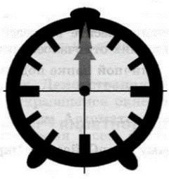 С помощью готовых фигур (вкладка Вставка) на пустом слайде изобразите циферблат с двумя стрелками. Это может выглядеть примерно так, как показано на рисунке. Чтобы циферблат был симметричным, сначала изобразите в центре экрана пересекающиеся горизонтальную и вертикальную прямые – оси симметрии. Пытайтесь рисовать рационально – копируйте повторяющиеся элементы, при необходимости изменяете их при помощи команд группы Повернуть.