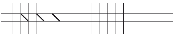 Как вы думаете, как же нам нарисовать такой узор? - (выслушиваются предположения детей) Давайте теперь нарисуем этот узор: Из левого верхнего угла проводим прямую линию в нижний правый угол, пропускаем одну клетку и рисуем такую же линию. Теперь давайте нарисуем еще один узор. Для этого с левой стороны от предыдущей строчки отсчитайте вниз две клетки и поставьте точку. От точки проведите линию в правый нижний угол. Затем в следующей клетке проведите линию из левого нижнего угла в верхний правый угол, и так до конца строчки