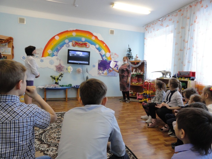 Воспитатель. А теперь приглашаем вас в наш сказочный кинозал на просмотр мультфильма «Зимняя сказка»)