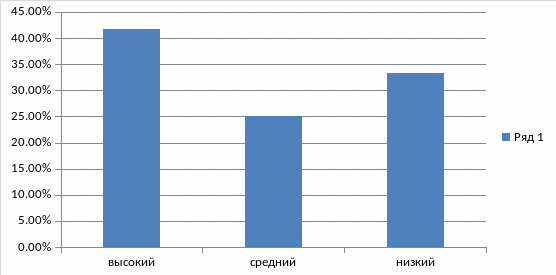 Мы выяснили, что уровень познавательных интересов (их интенсивность, активность познавательных потребностей у исследуемой группы обучающихся градируется: высокий уровень составляет 5 обучающихся, что составляет 41,7% респондентов; средний уровень - 3 респондента, это 25 %, низкий уровень 4 респондента, это 33,3 % (рисунок 1).