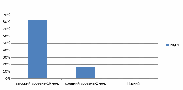 Среди опрошенных 12 респондентов высокий уровень познавательного интереса к учебному предмету «Технология» показали 10 обучающихся, что составляет 83%, средний уровень - двое обучающихся (17 %), низкий уровень- 0 % (Таблица 4. Рисунок 2).