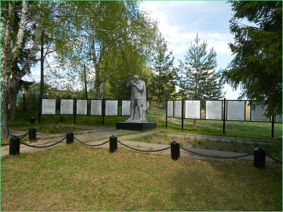 Памятник «Памяти жителей колхоза имени Ленина, погибших на фронтах Великой Отечественной войны 1941-1945 гг.» создавался в марте-апреле 1975 г. установлен в апреле – начале мая этого года. Открыт 9 мая 1975 г. Установлен в связи с празднованием 30-летия Победы советского народа в Великой Отечественной войне по заказу колхоза имени Ленина.