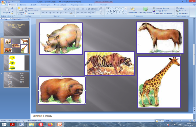Ребята, покажите хлопками, сколько в слове слогов, медведь жираф, носорог, тигр, конь.