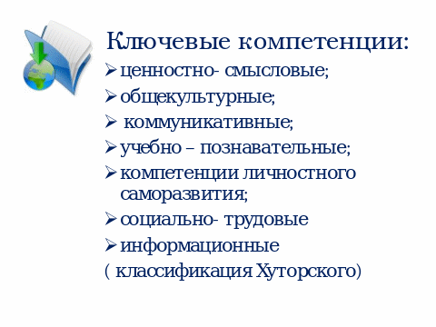 В переводе с латинского – competentia- означает круг вопросов, в которых человек хорошо осведомлён. Андрей Викторович Хуторской, доктор педагогических наук, академик Международной педагогической академии даёт следующую классификацию ключевых компетентностей:
