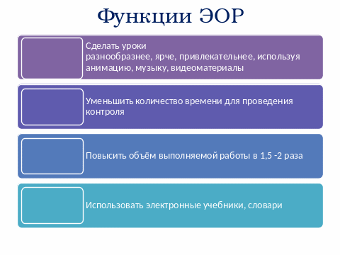 Использование электронных образовательных ресурсов позволяет: сделать уроки разнообразнее, ярче и привлекательнее, используя больше наглядности, в том числе анимацию, музыку, видеоматериалы; – вместить в урок гораздо больше дидактического материала для объяснения и закрепления темы; – уменьшить количество времени для проведения контроля и проверки знаний обучающихся; – привить обучающимся навыки контроля и самоконтроля; – повысить объем выполняемой работы на уроке в 1,5 – 2 раза; – обеспечить дифференцированное обучение, предлагая разноуровневые задания; – пользоваться различными справочными системами, электронными библиотеками, другими информационными ресурсами на уроках; – сформировать у обучающихся навык исследовательской деятельности